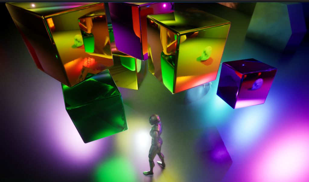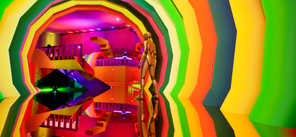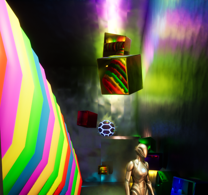 In line with my concept, I added a lot of color, different shapes, shiny surfaces, and objects behaving in a non-realistic way. For example, some objects sparkle when touched, or move without gravity. The interactive elements were designed to promote exploring. To enhance the experience, mechanics for grabbing, moving or manipulating the objects were added. For example, the Player can initiate a domino sequence, collect Trippin balls, throw around mirrored objects, pace jumps between objects in motion, and open a secret door to the second level.