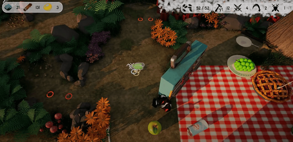 “Players take charge of a thriving ant colony in this real-time strategy game, where they will engage in battles with a rival ant colony. Gathering resources and constructing buildings provide a stronger colony, increasing its chances of survival in the harsh ecosystem of the insect world.”