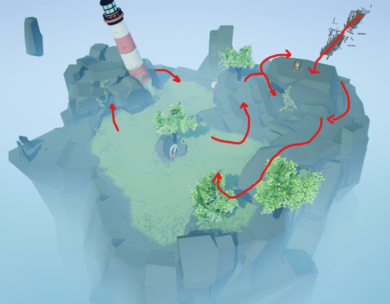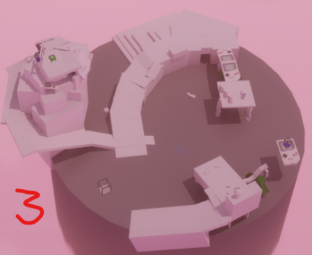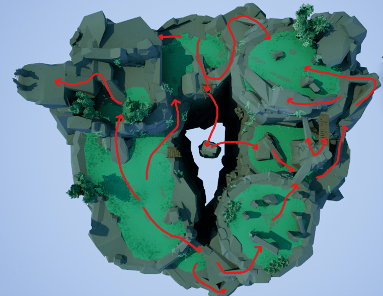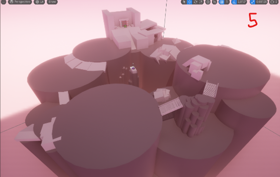Below, you can see the fifth Acceptance zone in an early stage blockout, back when it was supposed to represent Depression. First, I constructed a base in different heights, and from there I worked on bringing out verticality and multiple options when it came to paths and hiding-rushing. I also played with the idea of the Player finishing the level by jumping to the middle, almost falling down, yet making their way up. Gotta love the triumphic endings! This would later turn out to go well with the Acceptance theme too, especially with multiple options for paths!