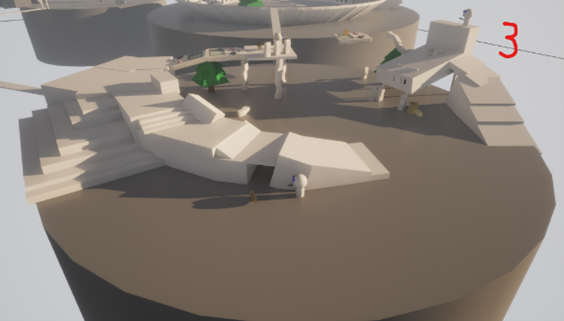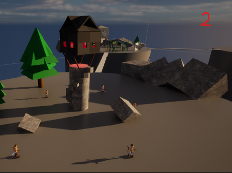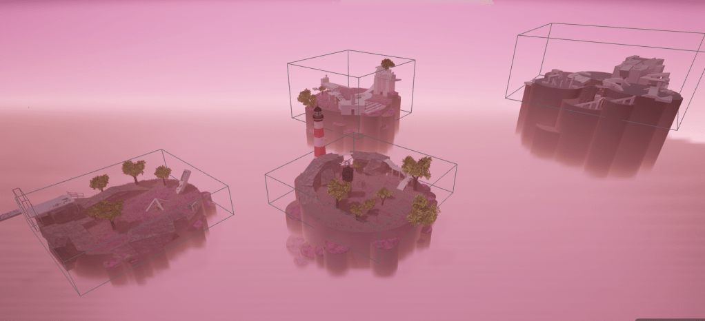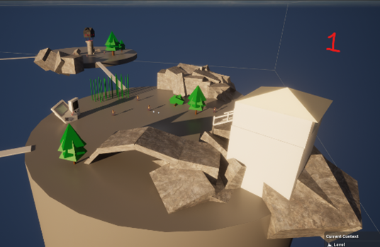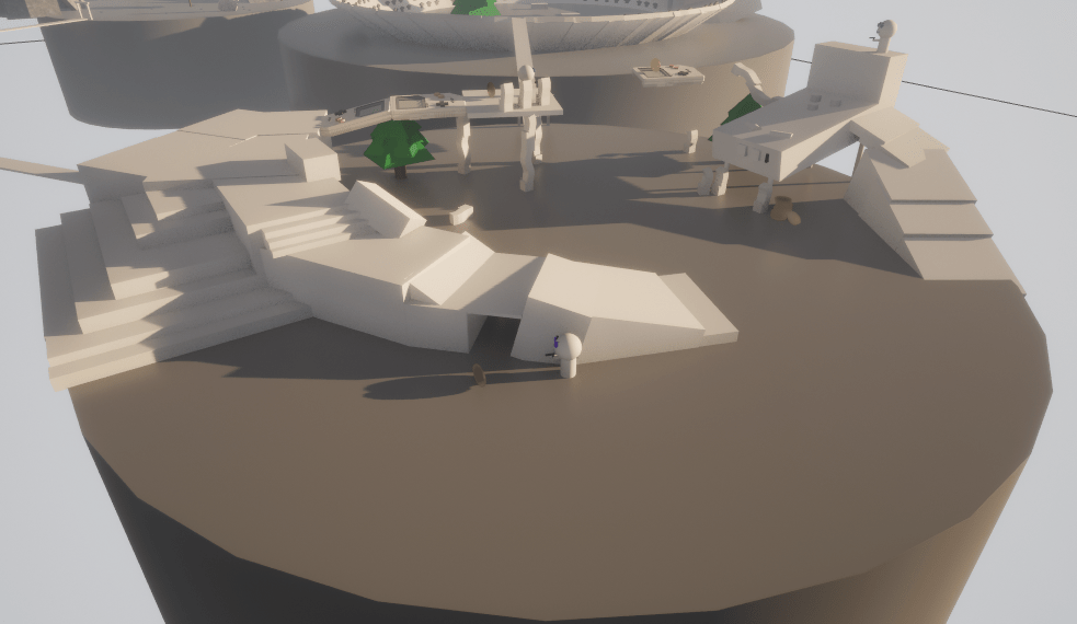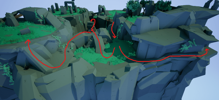 Working on the zones, I began constructing paths and regularly trying out their accessibility for both Player and enemy. My aim here was also to find the potential in whatever I placed out, to get the most out of it – such as designing bridge like structures that the Player can move both on and under. I also began to incorporate some elements/assets that were central to the theme – using them for the level design! Below, you can see the third Bargaining zone.