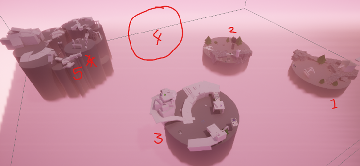 This is the first sketch I made planning the level. At first, I thought of having the pillars connected in the centre, but they were later made into separate pillars, to give better sense of progress and moving forward through the zones.