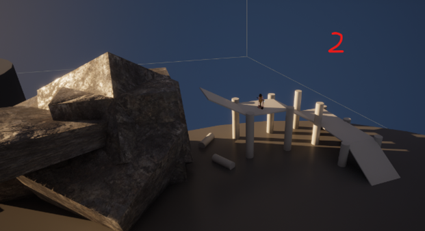 This zone was initially designed to represent the Depression stage. To finish the level, the Player would have to make a great leap straight into the pit. Falling down, the Player would aim for a thin pillar in the middle, where the portal to Acceptance would be. As in life, it is so easy to fall down, and harder to make it back up. The Player would have to find their inner strength to hold on, pick themselves up, and keep on going.