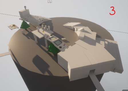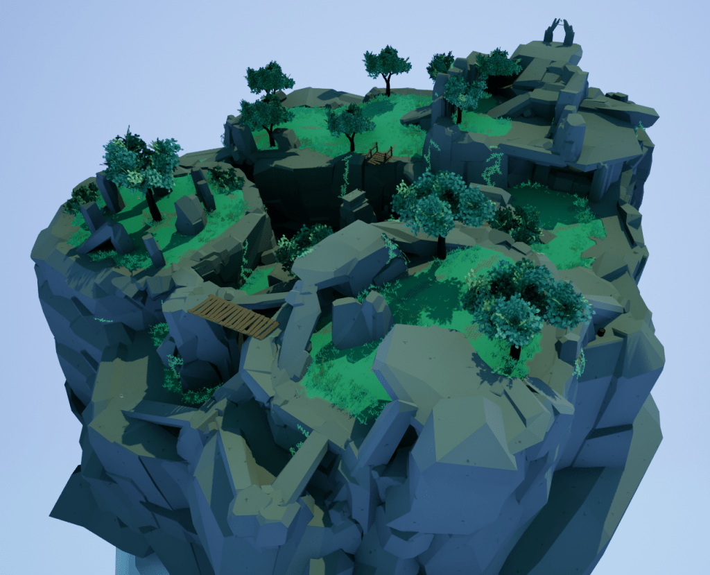 Pixel art mixed with Low poly. All assets (trees, stones, individual planks etc.) were hand placed.