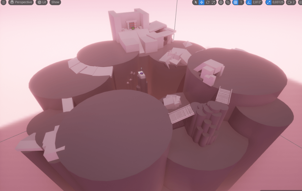 An early zoomed out view of the level. Even though the zones were supposed to have their own distinctive aesthetics, coloring and differences in promoting movement patterns, I tried to make them cohesive.